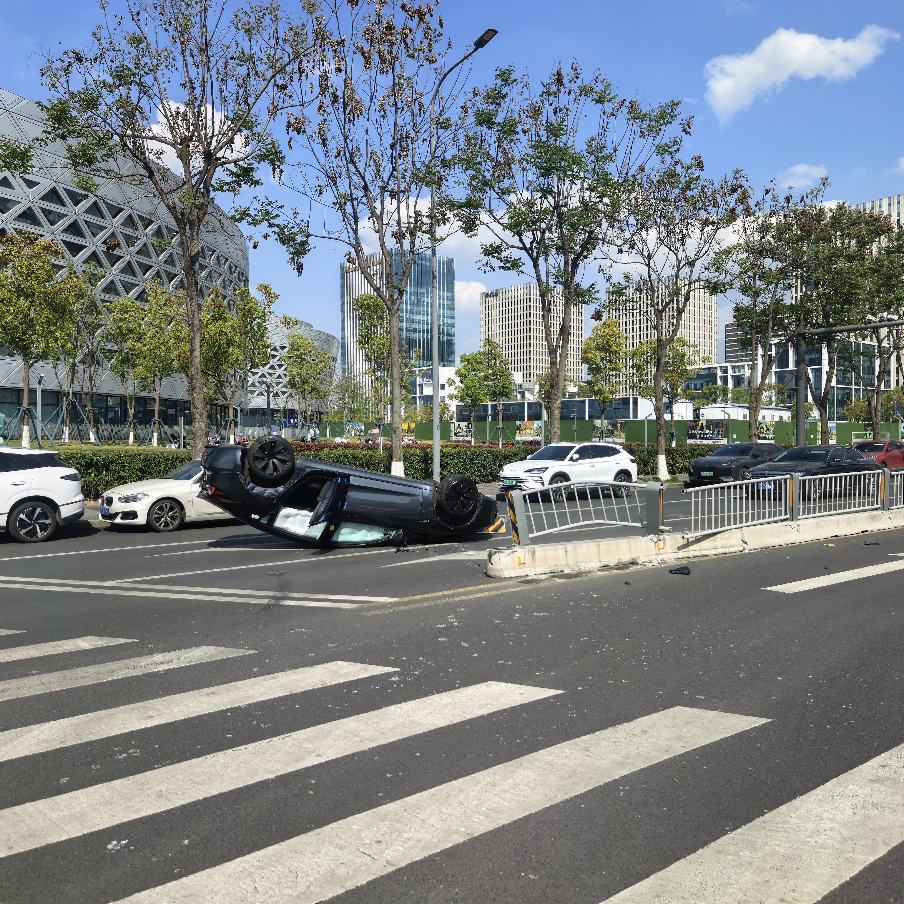 只是一次普通试乘,却因工作人员操作失误引发车祸,导致车辆撞上护栏后翻倒在路中间,车内安全气囊弹出。